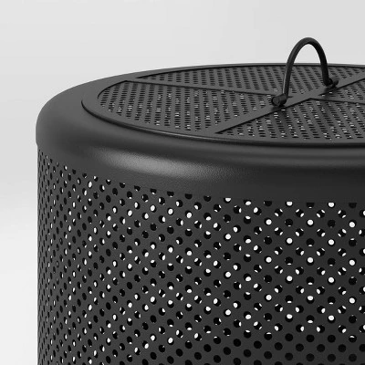 Your friends and family will love gathering in your outdoor space around this 25″ Metal Wood-Burning Lantern-Style Fire Pit from Threshold™. This beautiful patio fire pit features a modern design with heat-resistant iron construction in a matte black finish with perforated sides. The round firepit sits on three hairpin legs for a sleek look, and comes with a matching lid and poker for moving wood around inside.