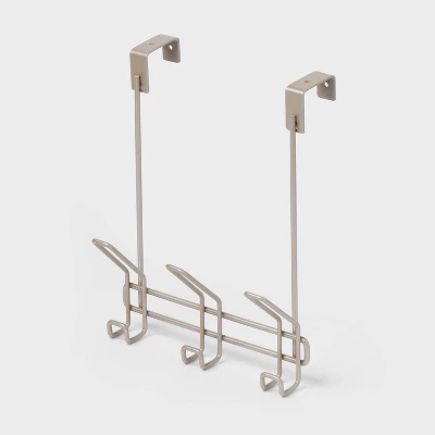 This Three Over-the-Door Hook from Threshold™ provides additional hanging storage in your bedroom, bathroom, laundry room and more. Designed with three metal hooks, it makes a perfect accessory for hanging hats, clothing items, towels, robes and more. It’s powder-coated silver finish brings lasting style and matches easily with just about any decor.