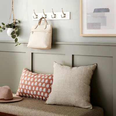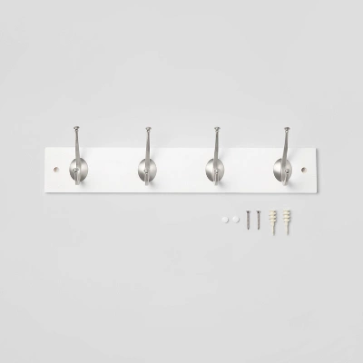 Hang your items up in style with this Silver and White 4-Hook Rail from Threshold™. This decorative traditional style hook rail showcases a flat white base that has four silver-finish hook points for hanging hats, coats, jackets, belts or other items. Just wall mount it in your laundry room, bathroom, entryway or kitchen to maximize storage space.