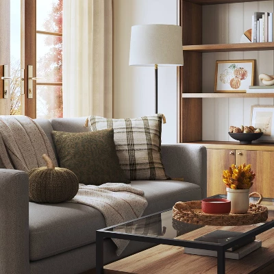 This Knit Pumpkin with Jute Stem Novelty Throw Pillow from Threshold™ will beautifully accentuate your space for the fall season. Made of 100% acrylic with a knit design detailed with ribs, the solid-color decorative throw pillow instantly grabs your attention with its plump pumpkin silhouette. This pumpkin throw pillow with a brown jute stem top adds autumn appeal to any bedscape or seating arrangement with its artistic illustration.