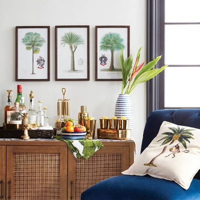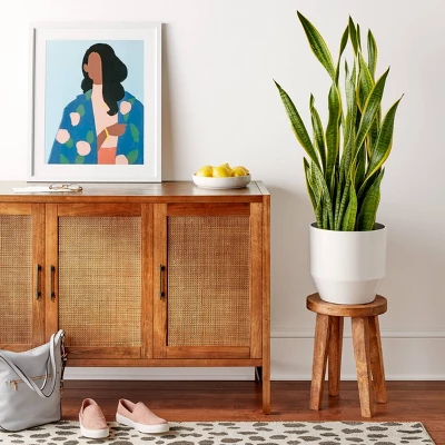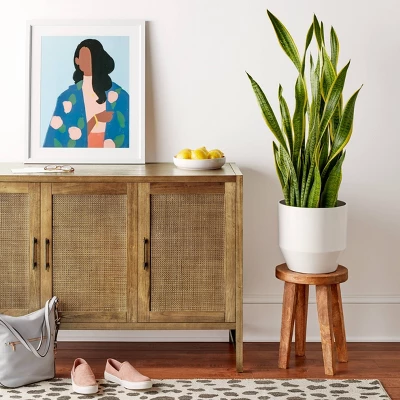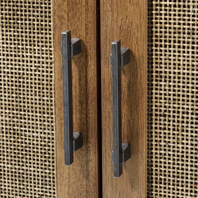 Give your entertainment area stylish, functional flair with this Warwick 3-Door Media Cabinet from Threshold™. Featuring a durable hardwood frame and standing atop a distinct trestle base with four legs, this compact TV unit strikes a clean-lined silhouette and boasts a neutral painted finish for a look that complements a variety of design aesthetics and color palettes. Designed to hold a 29-inch flat-screen TV, it features three doors that open to reveal spacious, adjustable shelves, plus a cord management system for clutter-free and neat organization. The doors are adorned with mesh-detailed fronts for eye-catching appeal, and they have sleek black metal pulls for easy opening and closing.